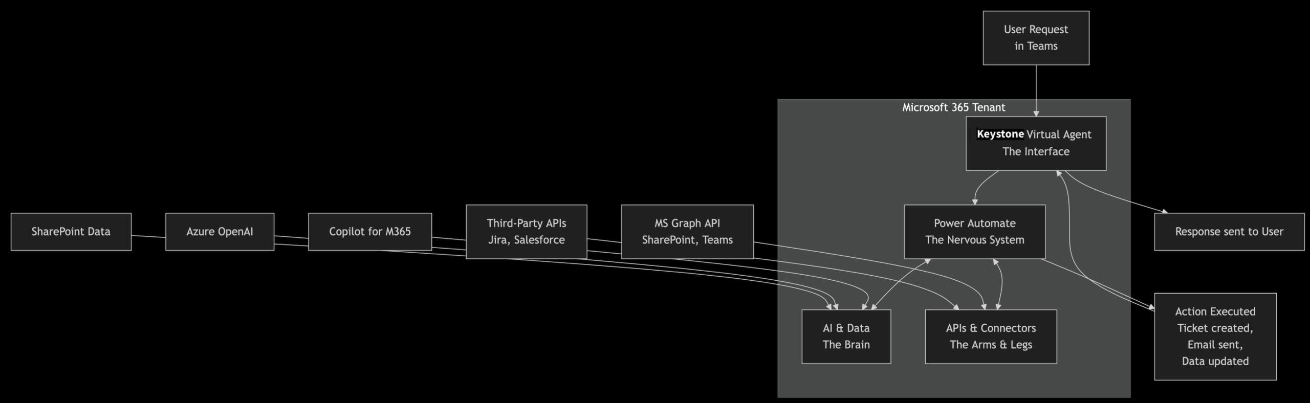You: Simply ask Keystone for what you need in everyday language, right in Microsoft Teams.2️⃣ Connect & Execute